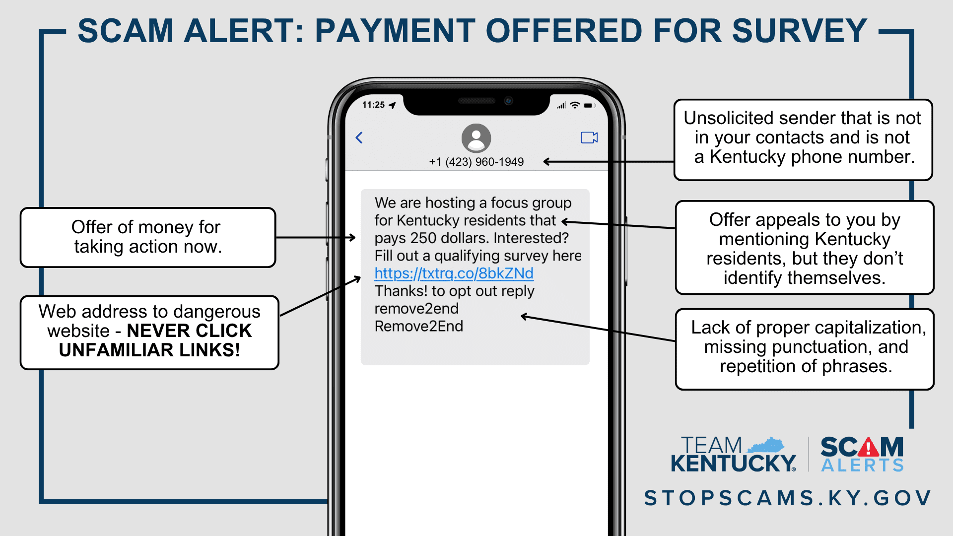A new texting scam targeting Kentucky residents has been identified. The text appears to offer $250 to Kentucky residents who complete a survey. The sender does not identify themselves and the link is attempting to collect personal information from the recipient. Do not click on this link or respond. DELETE the text and REPORT JUNK from your mobile device if you receive it.