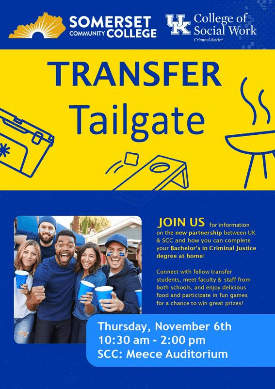 To celebrate this partnership, the CoSW and SCC will host a “Transfer Tailgate” on Thursday, November 6, at SCC’s Mecee Auditorium from 10:30 a.m. until 2 p.m. ET. The event will give SCC students the opportunity to connect with fellow transfer students, meet faculty and staff from both schools, and participate in games for a chance to win prizes.